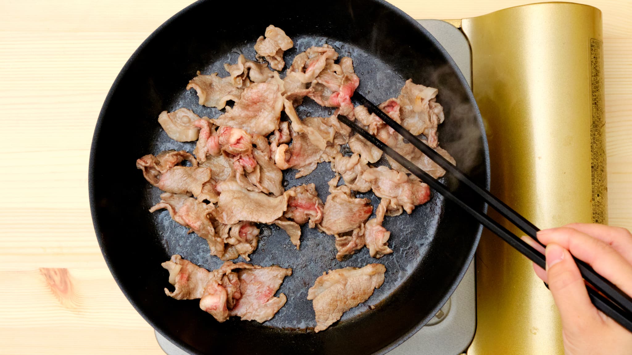 ③フライパンに油をひき、牛肉を炒める。